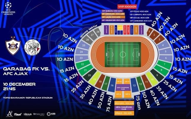 Dekbarın 10-da Tofiq Bəhramov adına Respublika stadionunda keçiriləcək matçın biletlərinin qiyməti aşağıdakı kimidir: